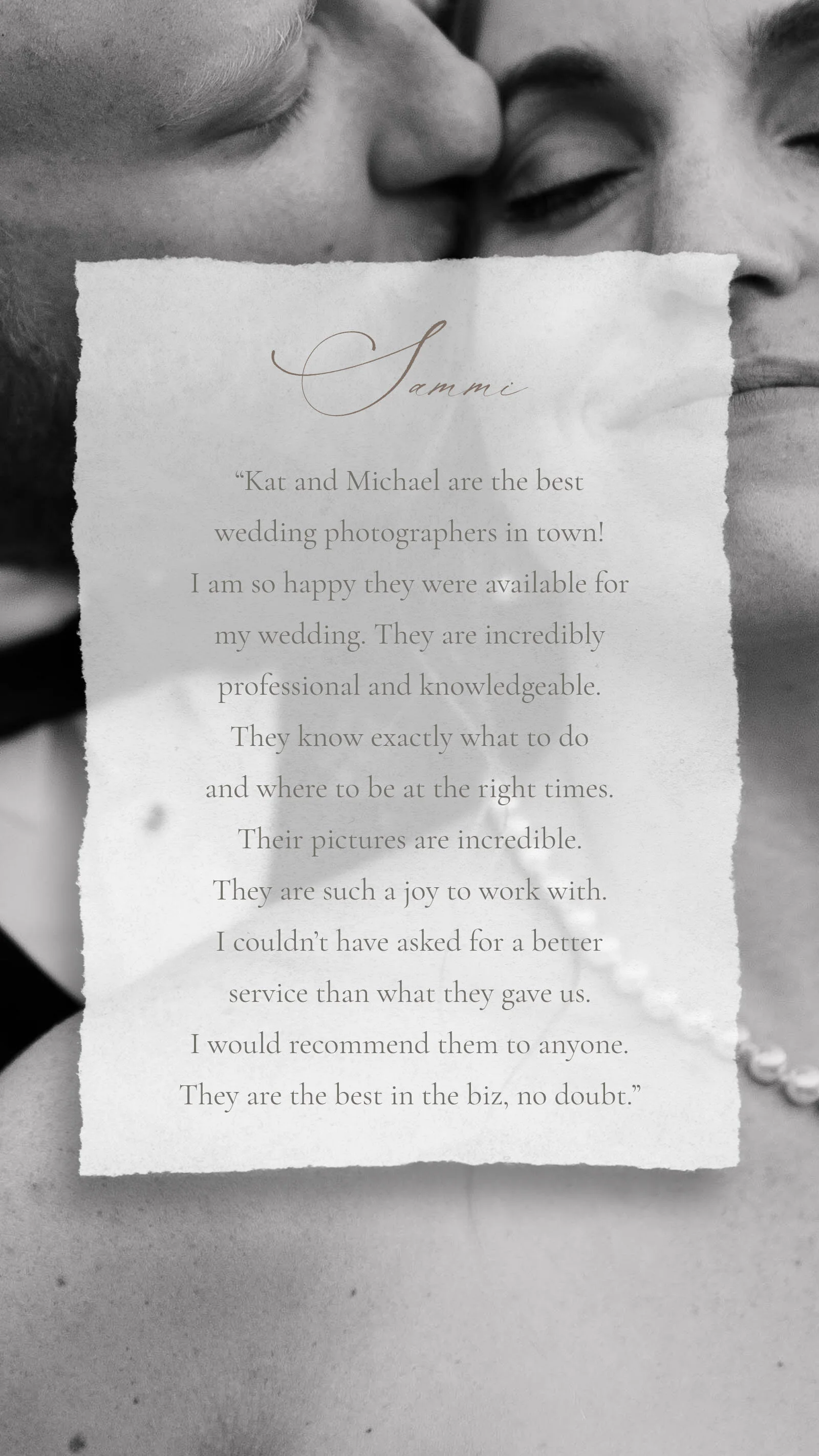 We, along with every photographer we hire, holds a high respect for wedding days. Most likely, we will be dressed in black or neutral tones. Our clothing is always comfortable, functional and professional to keep us moving throughout the many hours of your big day while blending in with your guests. We are efficient and effective in our work to guarantee a beautiful gallery of images to remember the best day of your lives. We love when other vendors appreciate working as a team to curate a brilliant event, which is why we provide a list of our preferred vendors that have proven to hold that same ideal. Every review we have received from brides, their loved ones and their vendors has been glowing and detailed—warming our hearts while proving our trustworthiness when it comes to capturing renowned events.